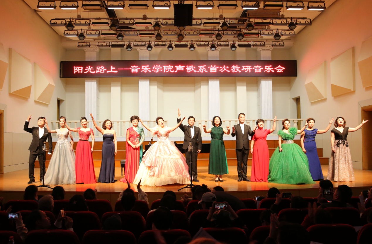 积极探索教研改革的一次全新尝试。音乐会上,老师们既演唱了《故乡是北京》《玛依拉变奏曲》《兰花花》等家喻户晓的中文歌曲,又展现了《我愿生活在美梦里》《我的家在那高山上》《诽谤》等西方经典歌剧片段,最后,由参演教师共同合唱的《阳光路上》把音乐会推向了高潮。整场音乐会充分体现了我校声乐教育专业的引领地位,体现了声乐教师团队的团结精神与合作意识,是“洋为中用”、西洋技术民族化的完美诠释。
