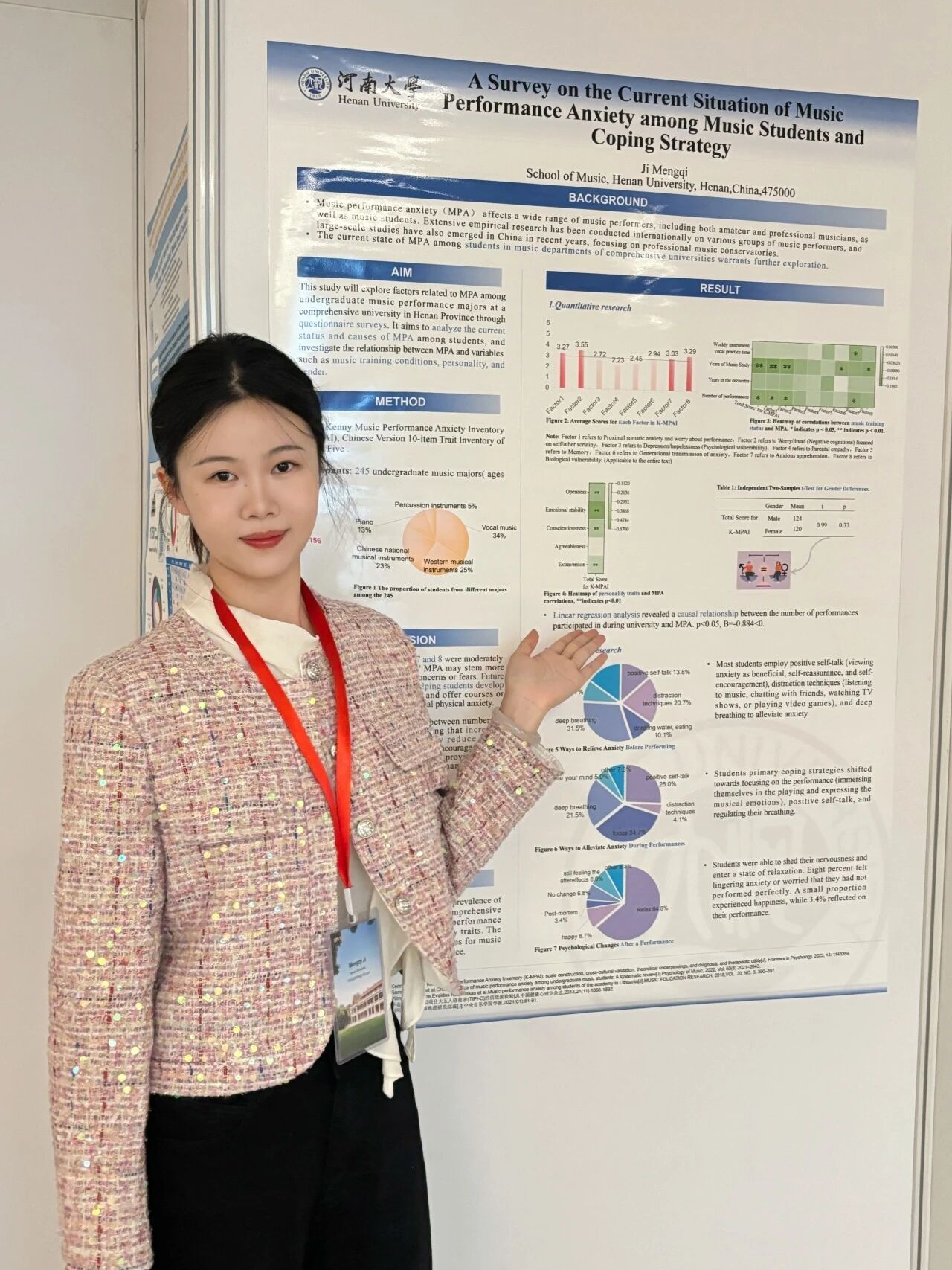 2024级艺术学硕士研究生(音乐教育学方向),在会议中报告的题目是《A Survey on the Current Situation of Music Performance Anxiety among Music Students and Coping Strategy》。旨在研究音乐专业大学生表演焦虑的现状与成因,分析音乐表演焦虑与音乐训练状况、人格、性别等变量之间的关系。对河南省某高校的245名音乐专业本科生的音乐表演焦虑现状展开问卷调查,测量工具采用Kenny音乐表演焦虑量表(K-MPAI)和中国版10项目大五人格量表(TIPI10)。描述性数据结果发现,大学生音乐表演焦虑的普遍性较高,其中K-MPAI量表第1、2、7、8维度得分较高,表明学生的音乐表演焦虑可能更多源于个人心理问题或恐惧。相关性分析结果表明,在音乐训练状况上,表演焦虑和学习音乐年限、大学期间参加表演次数显著性负相关;在人格上,表演焦虑和外向性(外向的、热情的)、尽责性(可靠的、自律的)、情绪稳定性(不易焦虑、冷静的)、开放性(乐于冒险、愿意接触新事物的)四个人格维度显著性负相关,与宜人性不存在显著相关。此外,研究还发现不同性别的表演焦虑差异性不大。该研究为音乐专业的表演实践和教育实践提供了启示和意见。