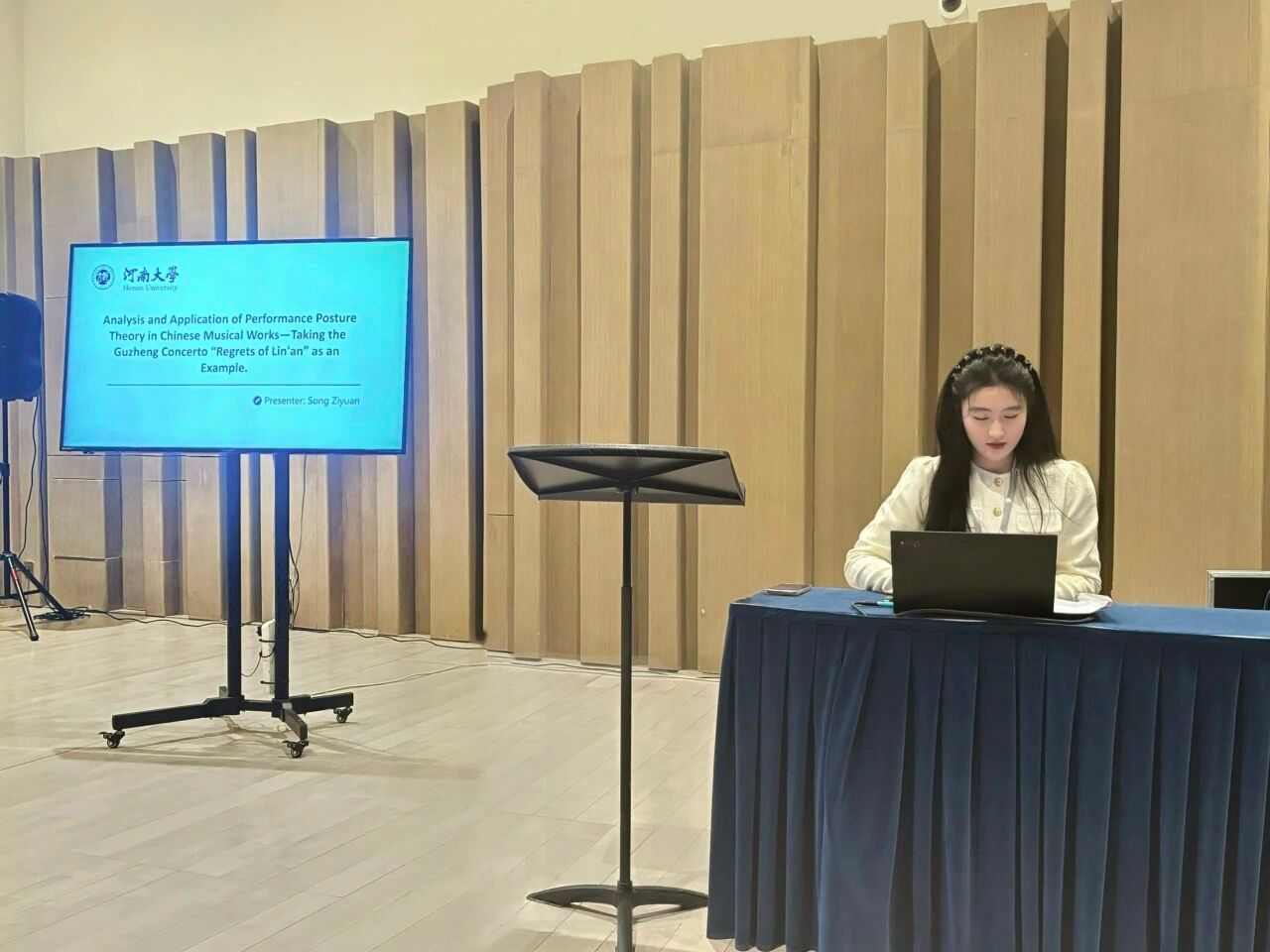 2025级音乐专业硕士研究生(音乐教育方向)。在会议中报告的题目是《Analysis and Application of Performance Gesture Theory in Chinese Musical Compositions: An Example from the Guzheng Concerto ‘Lin'an Remains Hate》。研究使用音乐表演姿态理论对中国音乐作品古筝协奏曲《临安遗恨》中的一个片段进行了可视化分析,旨在解释音乐表演姿态理论中四种姿态(音响生成姿态、音响辅助姿态、演奏交流姿态、音响伴随姿态)在表演过程中的具体表现。通过图表分析法,详细阐述了器乐演奏家、歌剧表演家和舞蹈家三种不同专业四种姿态的异同;通过物理软件Tracker,测量表演者身体头部运动并进行数据分析,得出了影响音乐姿态的因素,主要是与演奏的速度、力度和情感有关。该研究对音乐表演者、聆听者和教育者提供启示:表演者可以通过对音乐表演姿态理论的分析研究,从中找到自己的演奏个性,使舞台表演更加饱满丰富;聆听者可以通过音乐表演姿态理论来对表演者肢体动作进行分析,更好地理解乐曲的感情;教育者可以合理运用音乐表演姿态理论进行更加科学的、创新的教育教学。