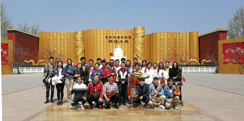 30余名师生赴新郑“黄帝故里景区”参加正式录制工作。虽已是深春,但天气乍暖还寒,同学们不顾冰凉的晨风,专心投入到工作中去。八点,阳光铺洒在广场上,拍摄也在这明媚的春光中开始了。乐曲声流淌在广场上,每件乐器都诉说着祖国风风雨雨的的七十年,每个人心里都流淌着对祖国的爱,大家共同歌颂着祖国的大好河山,更歌颂我们伟大的祖国繁荣富强。