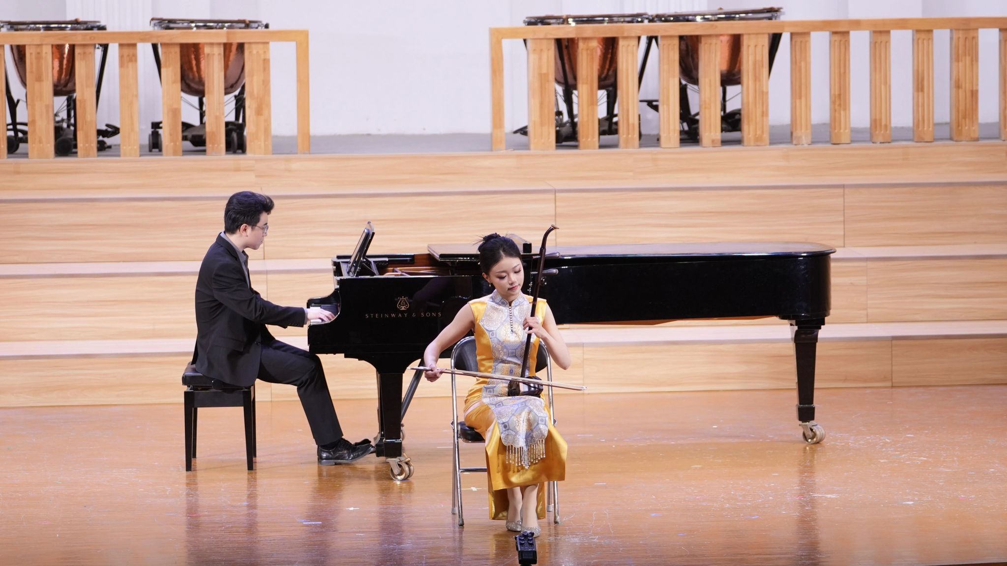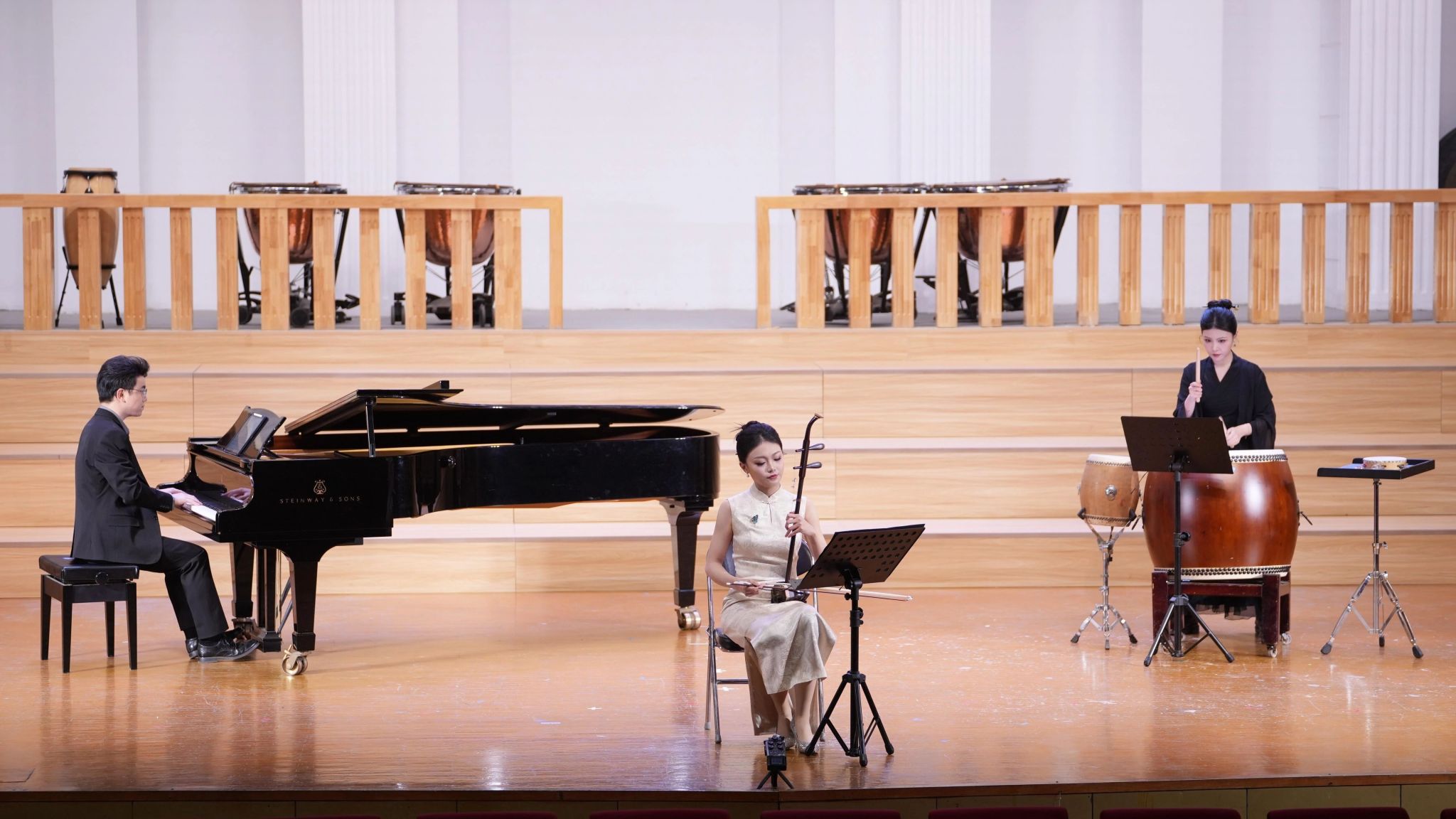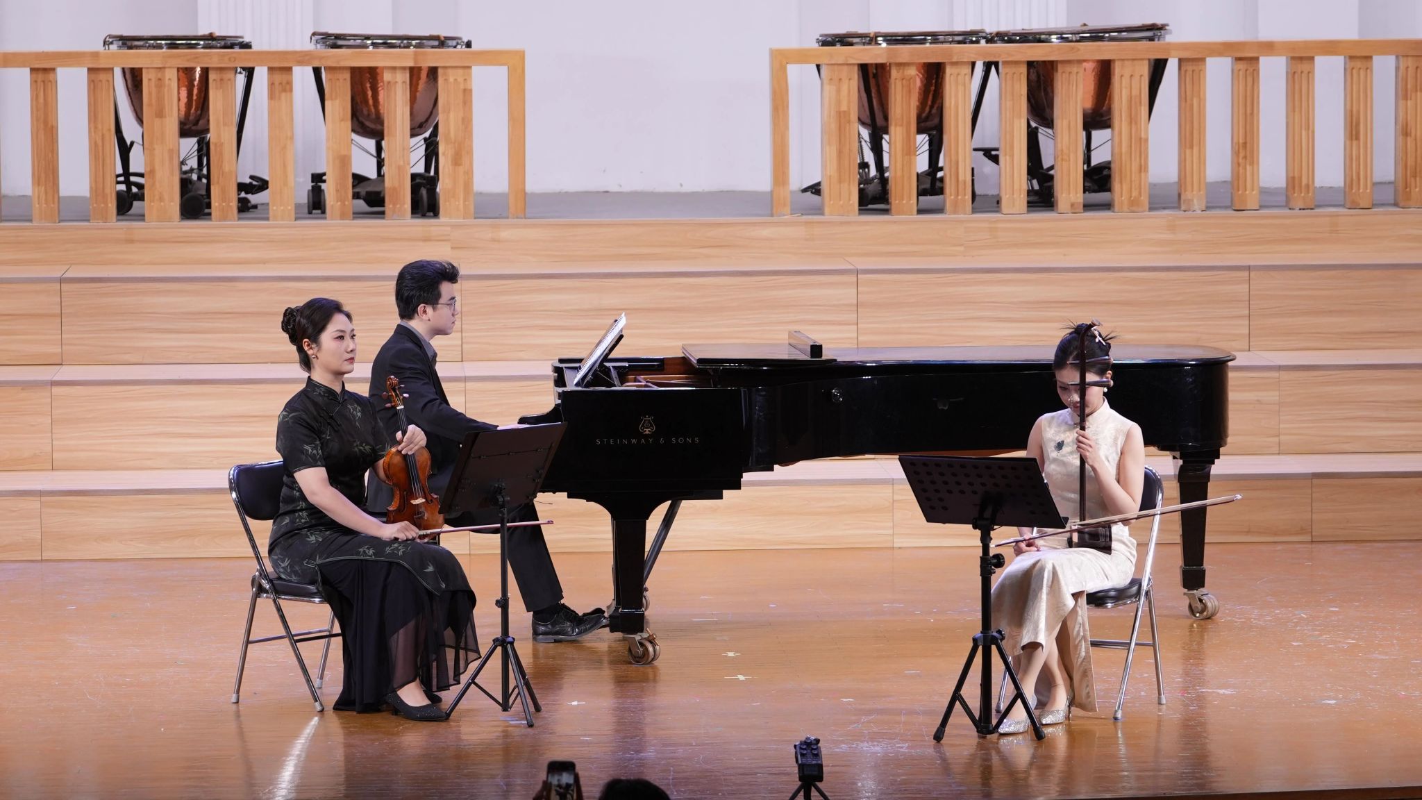 紧接着,郑博尹与卢琪、丁坤两位老师联袂演绎了当代二胡原创作品《梦寻长安》,悠扬的琴声勾勒出盛世长安的风貌,传递出对当代华夏发展成就的礼赞之情。
