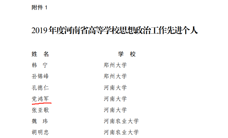 党委副书记党鸿军被评为河南省高等学校思想政治工作先进个人。