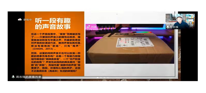在声音研究的导入环节之后,周老师带大家认识了本场讲座的关键概念:声音政治。在周老师那里,声音政治分为四个内容:声音霸权、声音的技术政治、声音政治批评、声音的资本主义。在一段广告视频带给听众一份静谧之后,周老师对其声音的阶级性做了精彩解读。