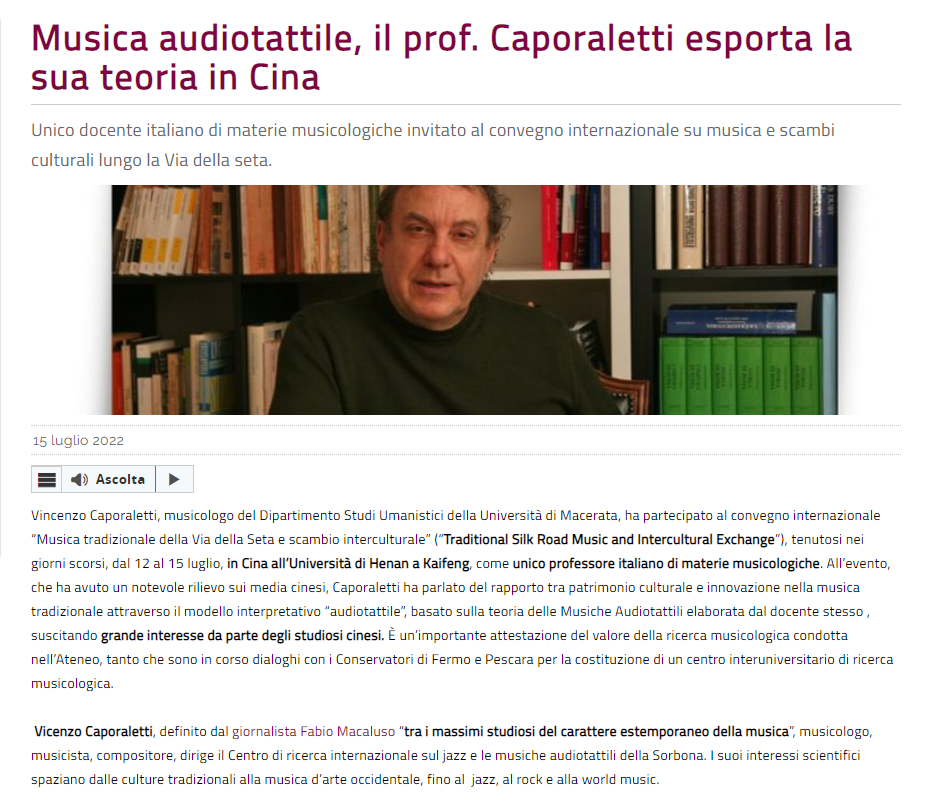 该校人文学院教授、意大利著名音乐学家、民族音乐学家Vincenzo Caporaletti受邀参加了此次会议。他以自创的理论:Teoria delle Musiche Audiotattili(声韵感知音乐理论)来诠释传统音乐文化遗产与创新之间的关系,为中国传统音乐在当代的传承和创新提供了一种新的研究视角。