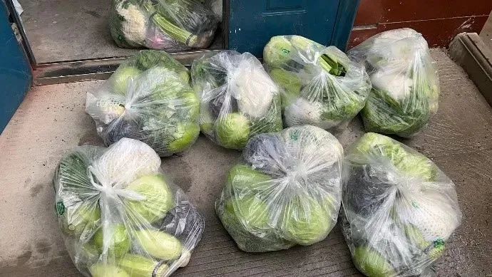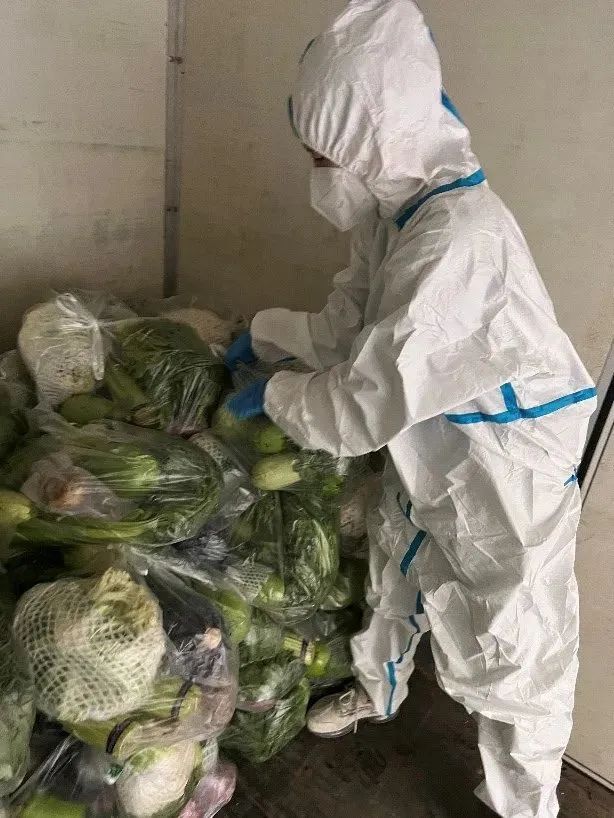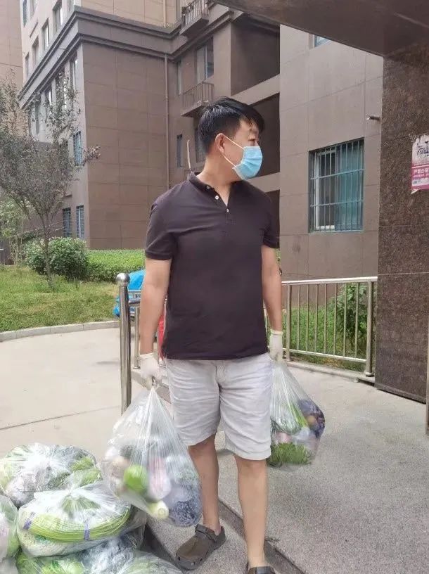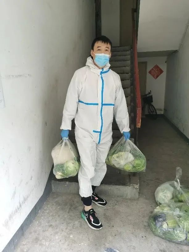 张志鹏老师是22号家属院的志愿者,周一飞老师和赵瑞新老师是21号家属院的志愿者。在疫情最紧张的时期,他们身穿白色防护服,将每一包沉甸甸的蔬菜,送到小区的家家户户。平平常常的蔬菜,此时此刻,饱含着来自学校的关爱和温暖和志愿者们辛苦的付出!