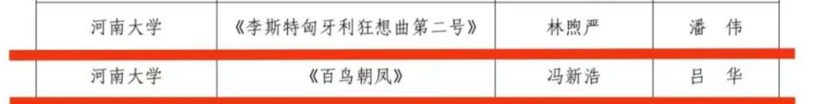 钢琴系作品《李斯特匈牙利狂想曲第二号》《百鸟朝凤》荣获专业组一等奖。作品《李斯特匈牙利狂想曲第二号》荣获“我最喜爱的大科节作品”奖。