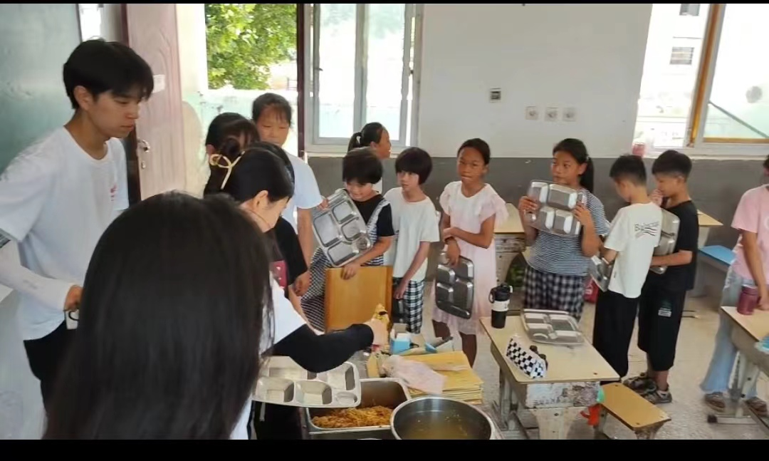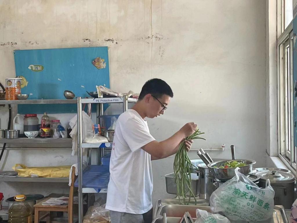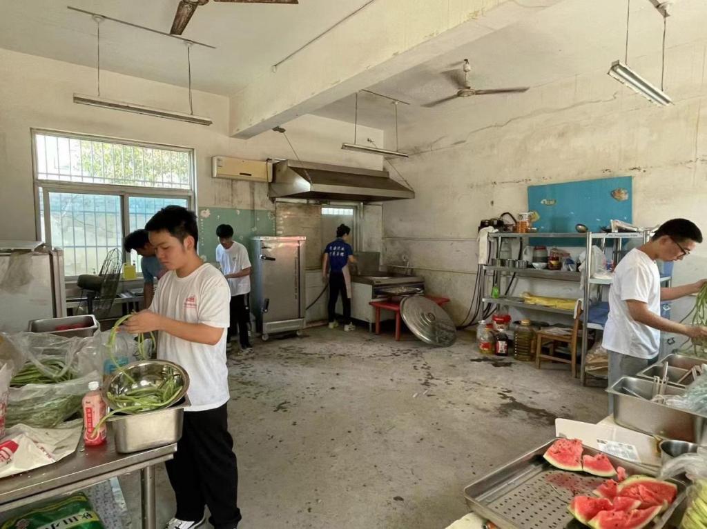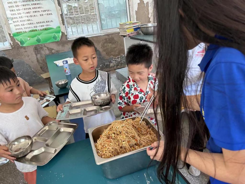 “蒲公英”支教团的志愿者们为老饭店小学的孩子们做饭、发饭