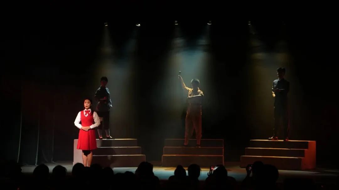 实验剧场迎来了一场别开生面的“青年大学习”——“飘扬的旗帜”《台词》课程教改成果展在此圆满落幕。此次活动不仅是对《台词》课程教学改革成果的一次总结展示,更是对青年学子爱国情怀和青春风采的生动诠释。学院党委副书记柴芳、副院长徐晏与各系师生共同观看了演出。