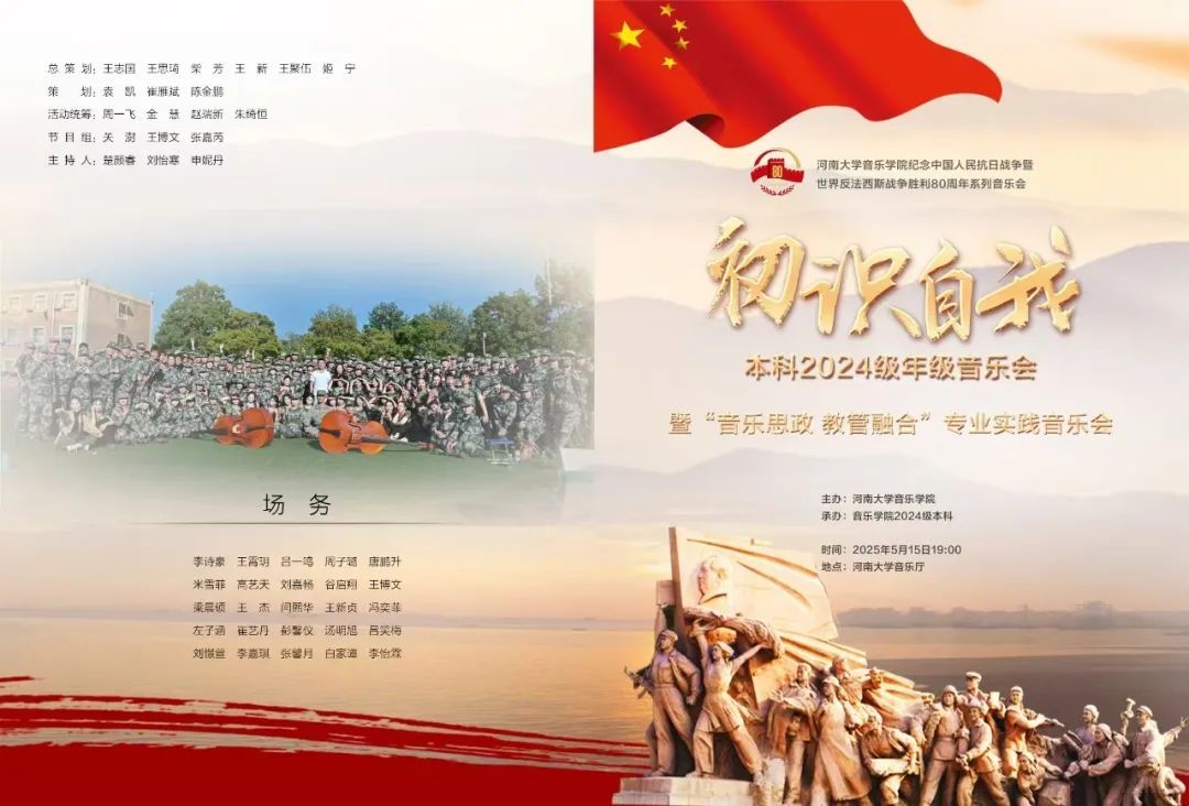 2025年5月15日晚,由河南大bilibili下载 主办、本科2024级承办的“初识自我——本科2024级年级音乐会暨‘音乐思政 教管融合’专业实践音乐会”在音乐厅成功举办,这也为bilibili下载 纪念中国人民抗日战争暨世界反法西斯战争胜利80周年系列音乐会拉开帷幕。院党委书记王志国、院长王思琦、党委副书记柴芳、副院长王聚伍及学院领导老师前来观看指导。