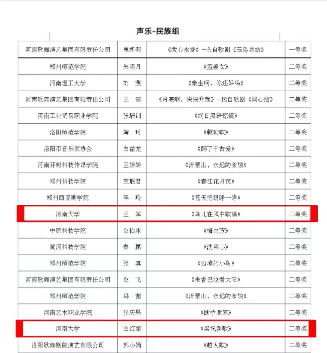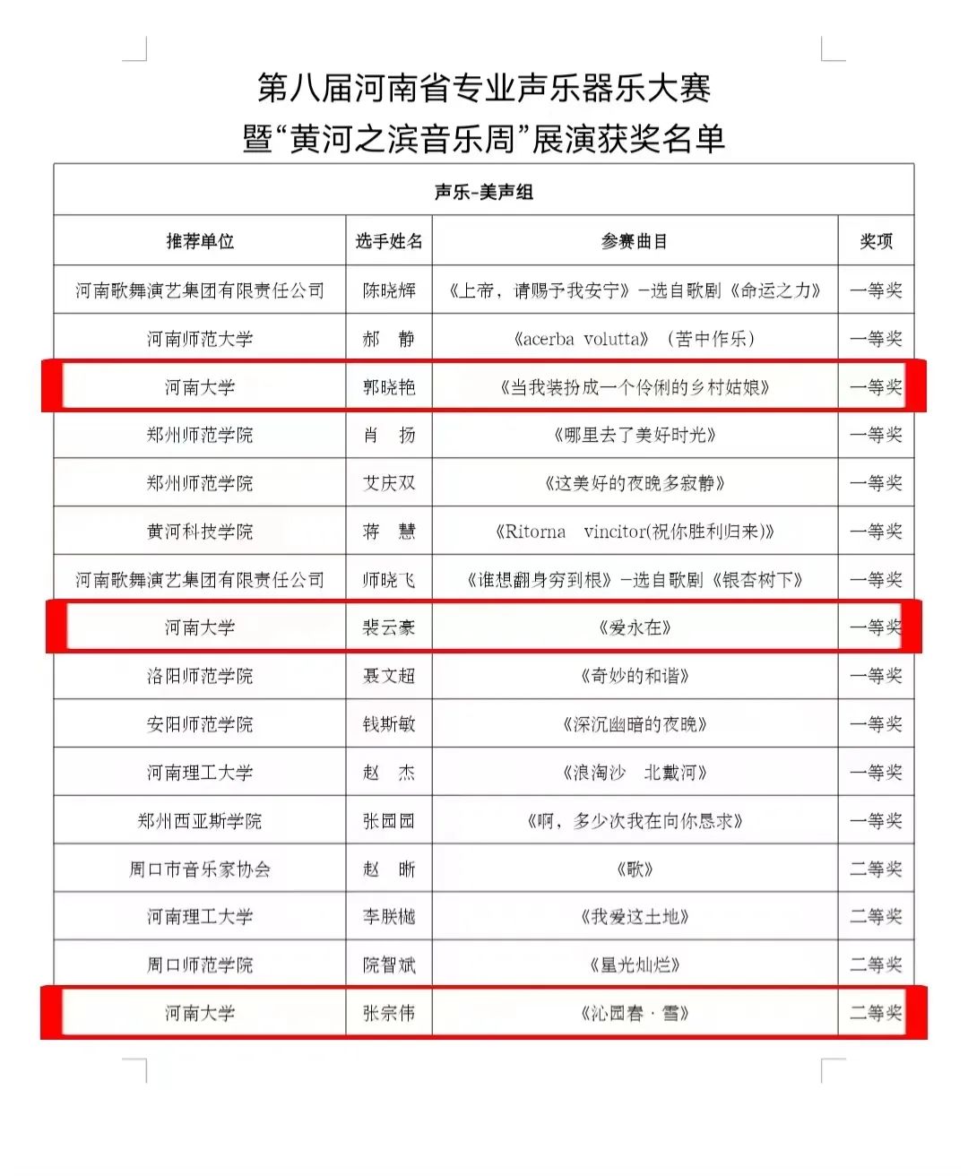教师郭晓艳、张宗伟、王军,硕士生裴云豪、白红丽、张炜懿荣获声乐组奖项。