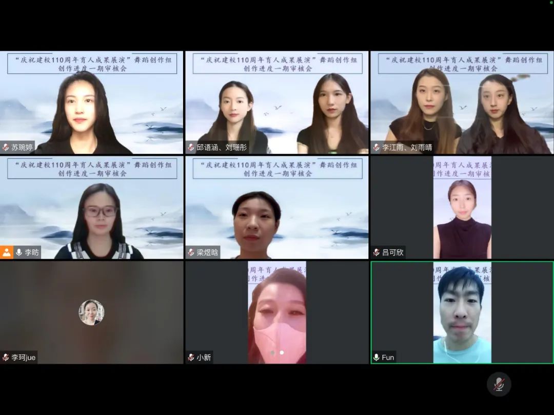 2022年8月27日18时,“庆祝建校110周年育人成果展演”舞蹈编导组创作进度一期审核会线上召开。总监李昉主持并讲话。