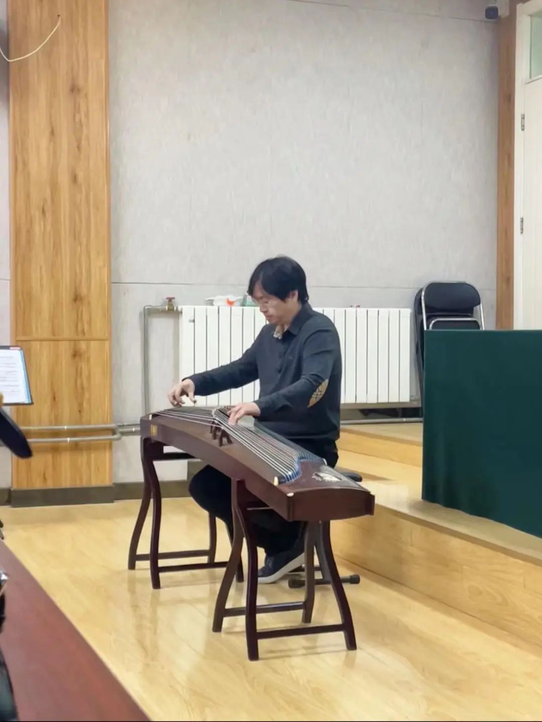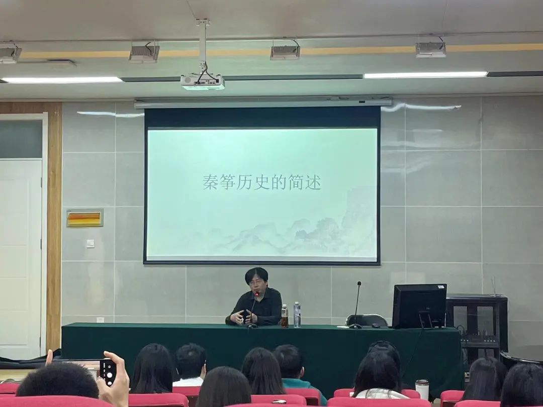他结合自身的演奏与教学经验,对陕西筝曲左右手演奏的基本功技术技法进行了详尽等梳理、讲解和示范。首先,他为大家讲解了历史上的秦筝。他谈到,《史记·李斯列传》中的《谏逐客书》是最早的关于秦筝的文献记载,由此可以推测,大约在2700年前,秦筝已在秦地流传。接着,他详细梳理了秦筝的发展经过,着重介绍了新中国成立以来,陕西筝派的形成及特点,与同学们探讨了古筝起源的问题,肯定了“筑为筝源说”的学术观点,提出古筝最早的制作材料可能是竹子的猜想。