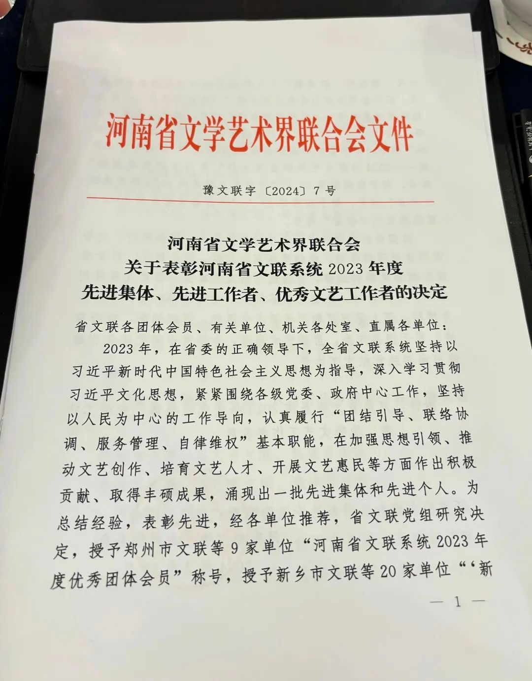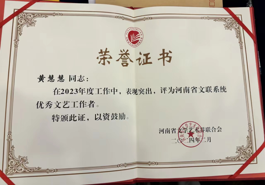 黄慧慧老师荣获河南省2023年度优秀文艺工作者
