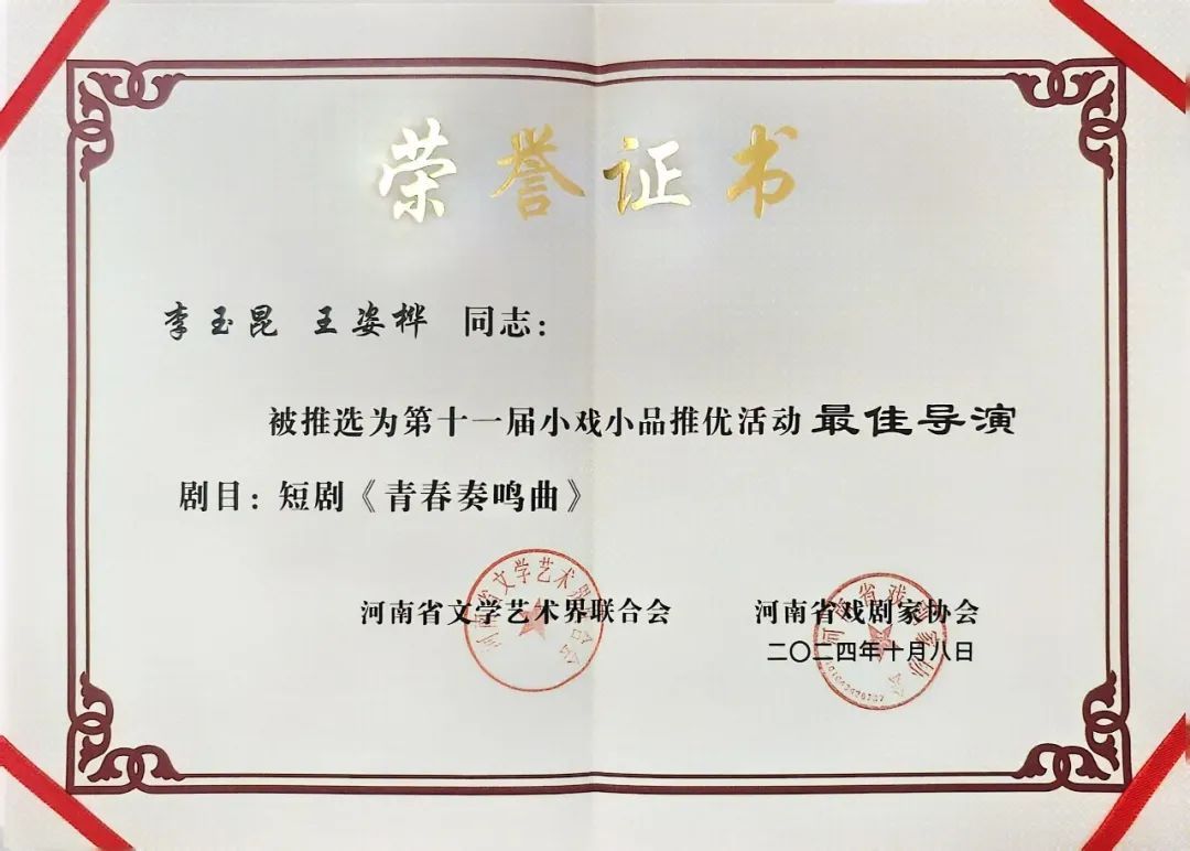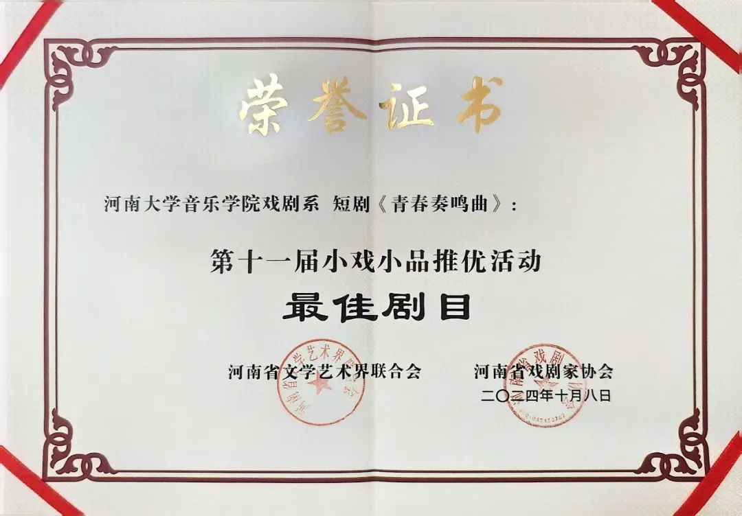 《青春奏鸣曲》的获奖不仅是对导演和演员们辛勤工作的肯定,也是对bilibili下载 戏剧系教学成果的最好证明,这部作品的成功,也将激励着戏剧专业的师生们始终牢记bilibili下载 的院训:立德,修身,乐艺,践行,以饱满的创作热情和砥砺奋进的创新精神迎接未来更多挑战,为学院再创佳绩,并将持续提高自身文学内涵与艺术修养,致力于创造出更具深意与传承价值的精品力作,为河南戏剧艺术贡献磅礴力量