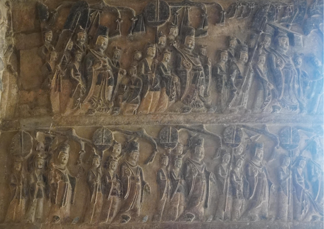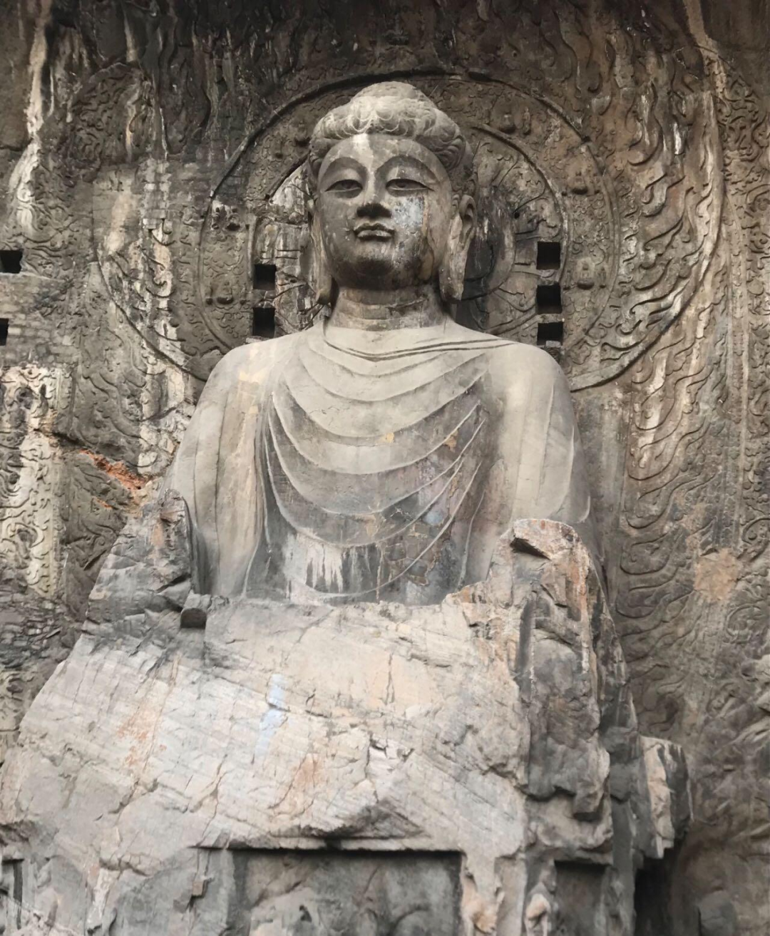 洛阳龙门石窟规模庞大,造像丰富,保存了我国北魏至清末的石窟艺术,但因各种原因,部分石刻较为模糊,未能得到更好的保存。北魏时期的代表洞窟有宾阳中洞,其前壁内侧与巩县石窟一致,同样刻有帝后礼佛图。隋唐时期的代表洞窟有著名的大卢舍那像龛,开凿于唐高宗时期,其雕刻线条圆润、佛像体态流畅、面庞安详,整体装饰精美,展现了唐代造像艺术的高超技艺。