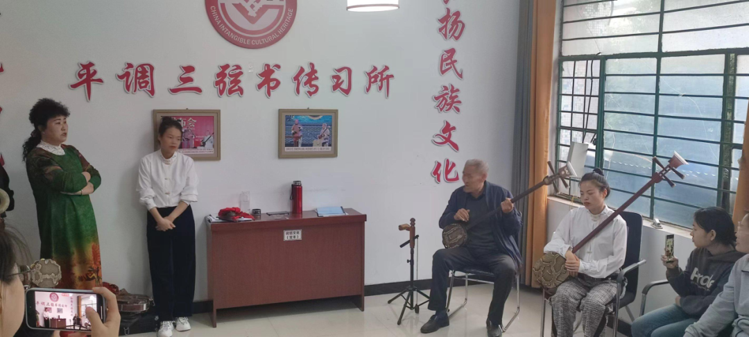 活态传承的第二个重点考察对象是曲艺之乡宝丰县的平调三弦书,考察团来到传承人李春迎老师的工作室。李老师向大家讲述了目前曲艺传承的困境和平调三弦书的传承现状,并展示了作品《劝善歌》和《劝闺女》。其中,《劝闺女》有说有唱、韵散结合,李春迎老师一人分饰“父亲”“母亲”两个角色,表演分为正劝和反劝两部分,展现了平调三弦书的魅力。演出结束后,团队成员还体验了平调三弦书的伴奏乐器三弦,并与在场老师交流演奏经验。