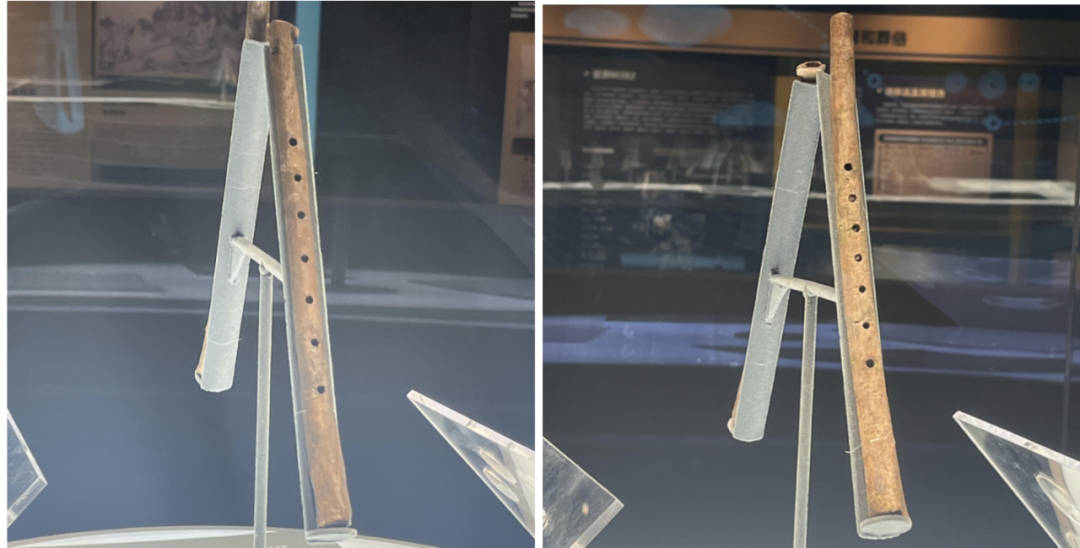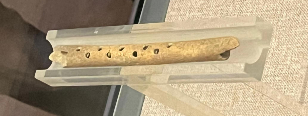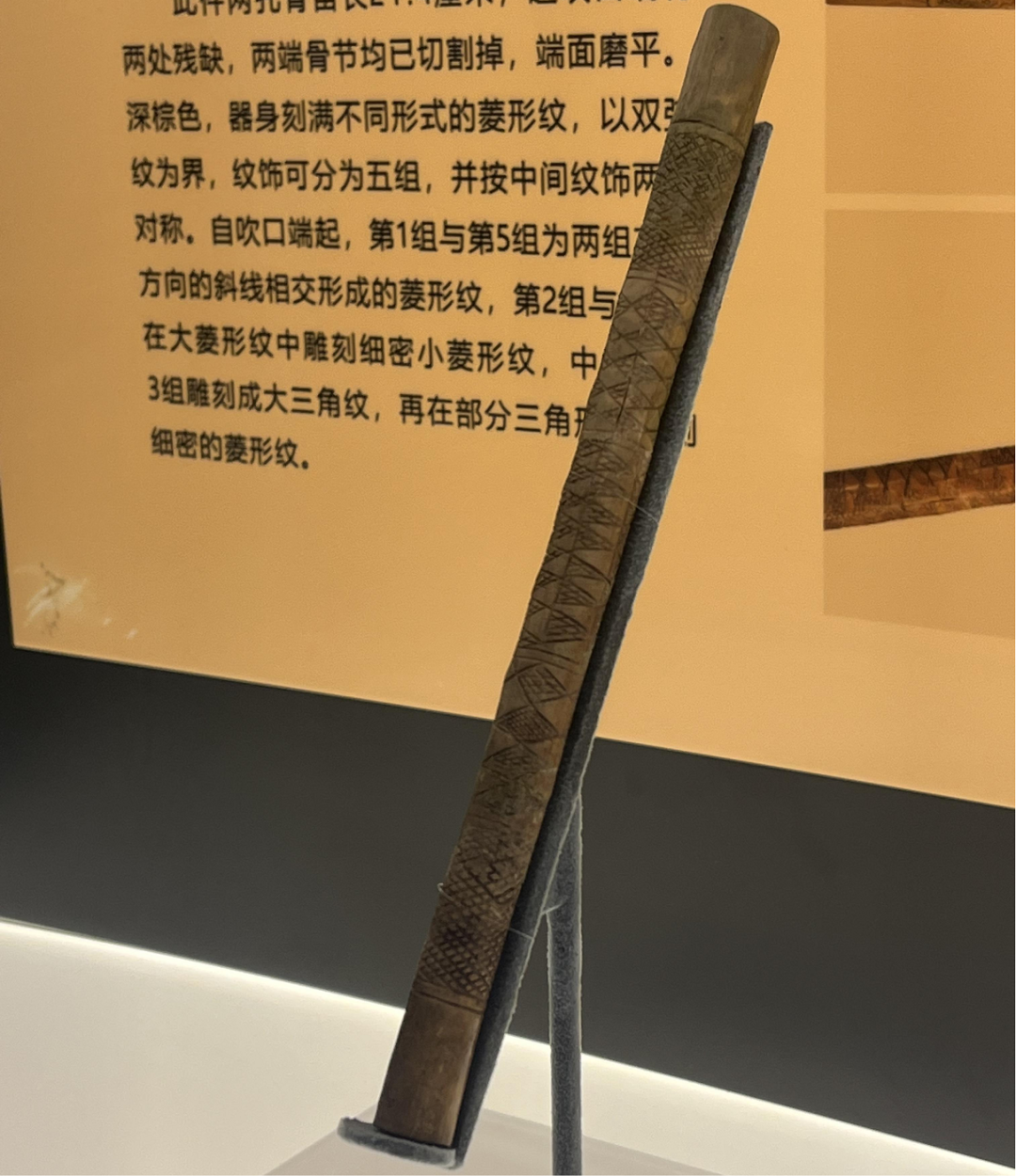 考察团一行在贾湖遗址博物馆,聆听了来自9000年前的乐音。贾湖骨笛的出土,表明九千年前的中原大地上已升起了华夏音乐文明的曙光。该博物馆有两件最具代表性的器物,一件是一墓双笛,一雌一雄。雄笛管身较长,雌笛较短,均为7孔,制作规范,形制固定。另一件二孔骨笛,周身刻满不同形式的菱形纹,这支也是所有出土骨笛中唯一一件刻有纹饰的骨笛。