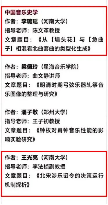 陈文革教授指导的硕士研究生李璐瑶、李法桢副教授指导的硕士研究生王光亮的论文,在“中国音乐史学”组别中脱颖而出,荣获“优秀学位论文”。