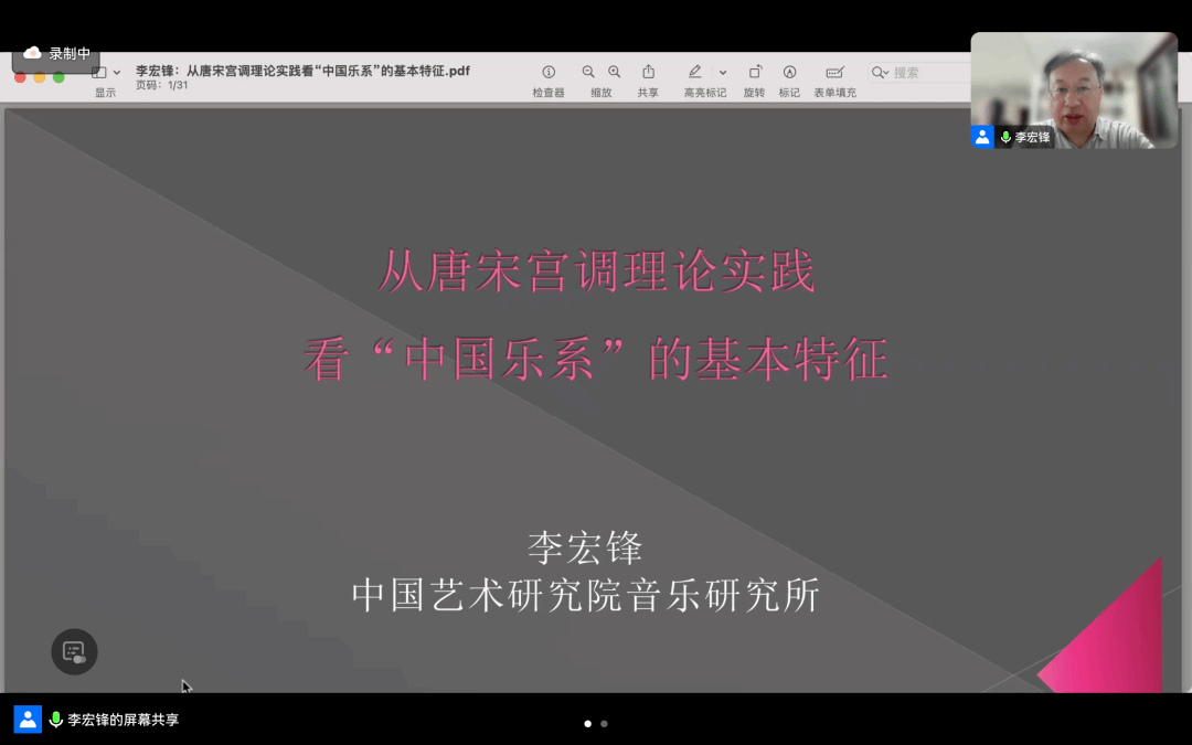 《中国音乐学》主编、中国艺术研究院音乐研究所博士生导师李宏锋研究员以“从唐宋宫调理论实践看‘中国乐系’的基本特征”为题,分析了中国传统乐学理论体系、宫调实践形态和“中国乐系”的基本特征,并以新疆传统音乐为例,说明唐宋音乐风格在当代的遗续,指出要以历史的维度从更广泛的层面理解中国乐系,以及不同文化、不同文明属性的音乐文化。
