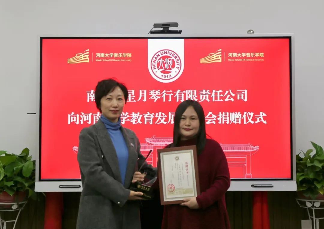 教育发展基金会秘书长刘婷向捐赠方星月琴行有限责任公司王景玲颁发捐赠证书和纪念杯