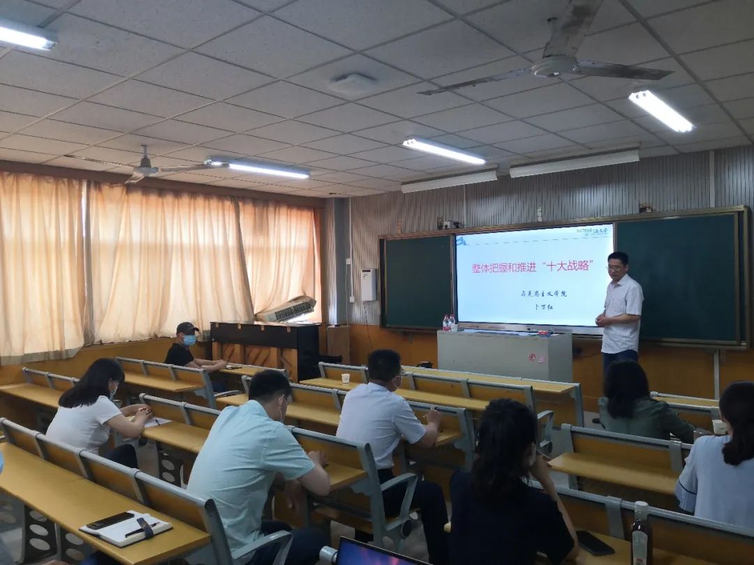 会上,马克思主义学院副教授、硕士生导师卜万红作了题为《整体把握和推进“十大战略”》的报告。卜老师对我省第十一次党代会的主题进行了详细解读,并对“十大战略”进行了深入分析。指出十大战略和我省 “谋振兴、促崛起、求跨越、争出彩”的30年发展主题主线一脉相承,同国家和省委对到本世纪中叶的建设规划遥相呼应,为河南省定下了九个清晰的中期发展目标,为我省补短板、强基础、扬优势指明了方向;从整体布局上看,十大战略有助于稳定传统动力、寻找新动力,既坚持传统优势提升,又着力寻找新增长点,确保高质量建设现代化河南,高水平实现现代化河南。