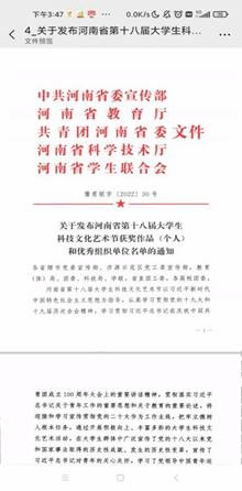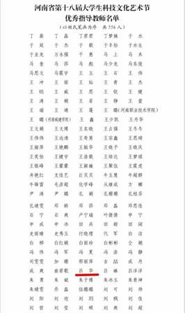 在河南省第十八届大学生科技文化艺术节中,由支部书记吕华指导2020级本科生冯新浩演奏的中国经典钢琴作品《百鸟朝凤》,荣获器乐专业组一等奖,吕华荣获优秀指导教师。