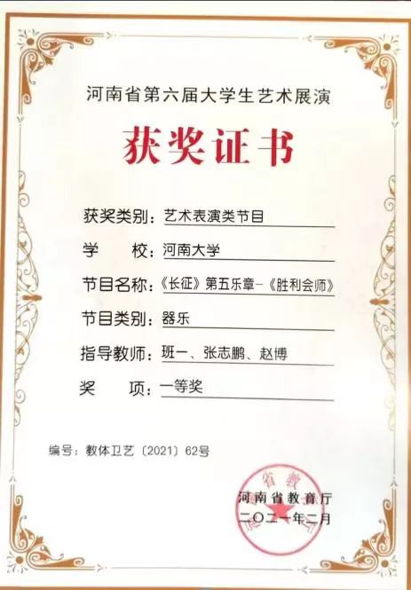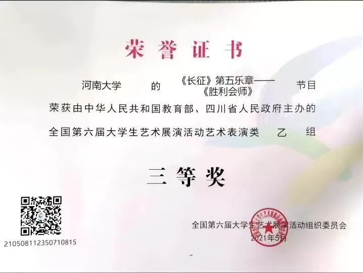 支部党员宋飞作为至善交响乐团成员,随团参演的交响乐作品《长征》第五乐章——《胜利会师》获“全国第六届大学生艺术展演活动”艺术表演类乙组“三等奖”,同时获“河南省第六届大学生艺术展演”艺术表演类节目“一等奖”。
