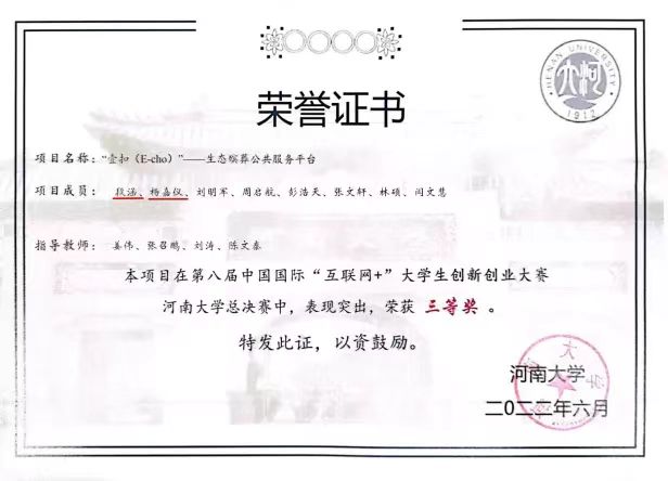 支部党员段涵、杨嘉仪所参与的项目《无极限运动》和《“壹扣(E-cho)”——生态殡葬公共服务平台》在第八届中国国际“互联网+”大学生创新创业大赛bilibili下载 总决赛中分别获“优秀奖”和“三等奖”。在2022年bilibili下载 大学生节能减排社会实践与科技竞赛中,两位同志所在的项目《“智”集——电动智能垃圾车回收机器人》获科技作品类“三等奖”。