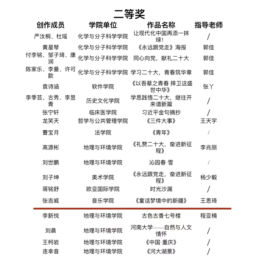 《吾辈心向党 青春著华章》《努马阿美》《庆丰收》《皮黄》四个音乐类作品荣获一等奖;《相遇》获得音乐类二等奖;《人与自然—塑》获得音乐类三等奖!赵瑞新老师荣获“优秀指导教师”称号。