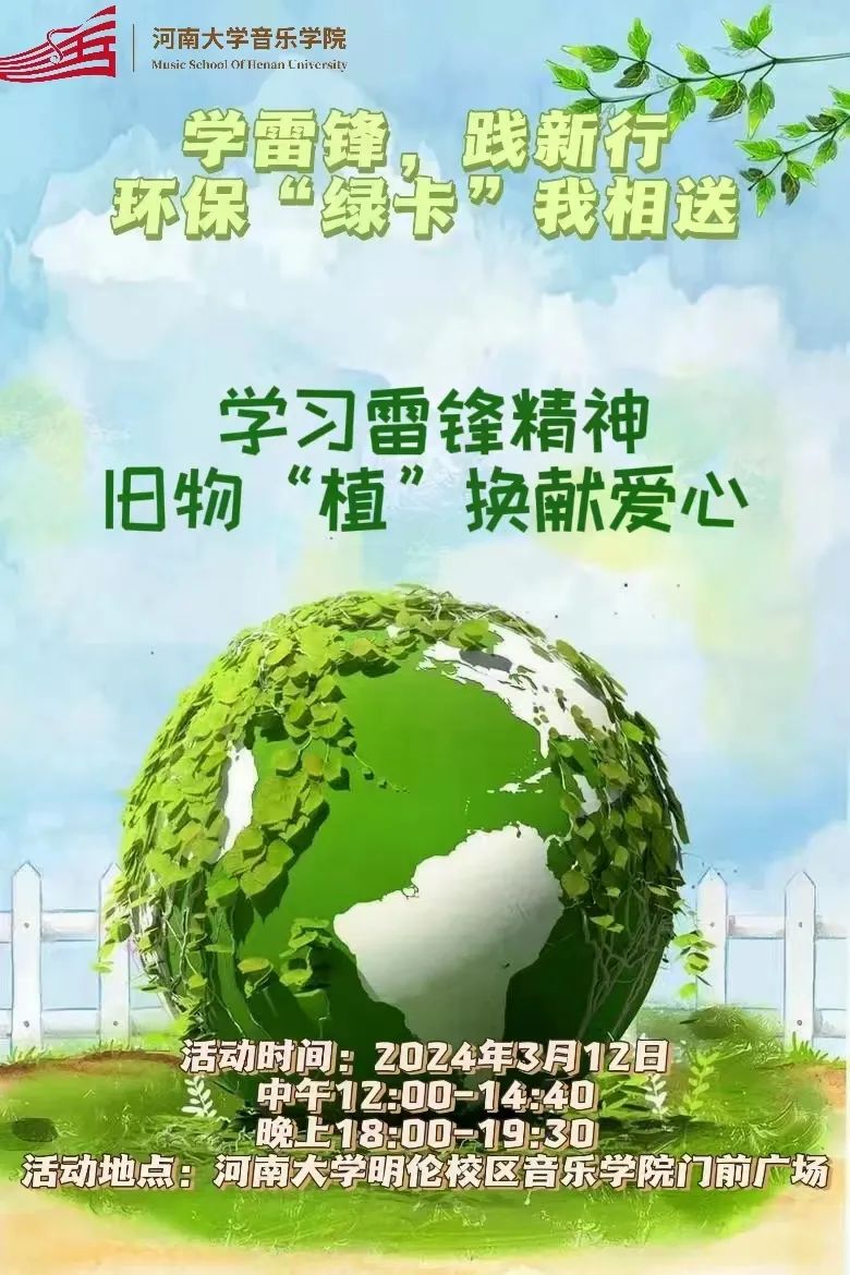 团委将于2024年3月12日“植树节”当天举行雷锋月“学习雷锋精神 旧物“植”换献爱心”之我为环保做件事活动。此次活动为了丰富广大在校生的课余生活,培养学生的环保、回收节约意识,给同学们提供一个以可回收资源换绿植的爱心公益平台,为文明校园建设贡献力量。