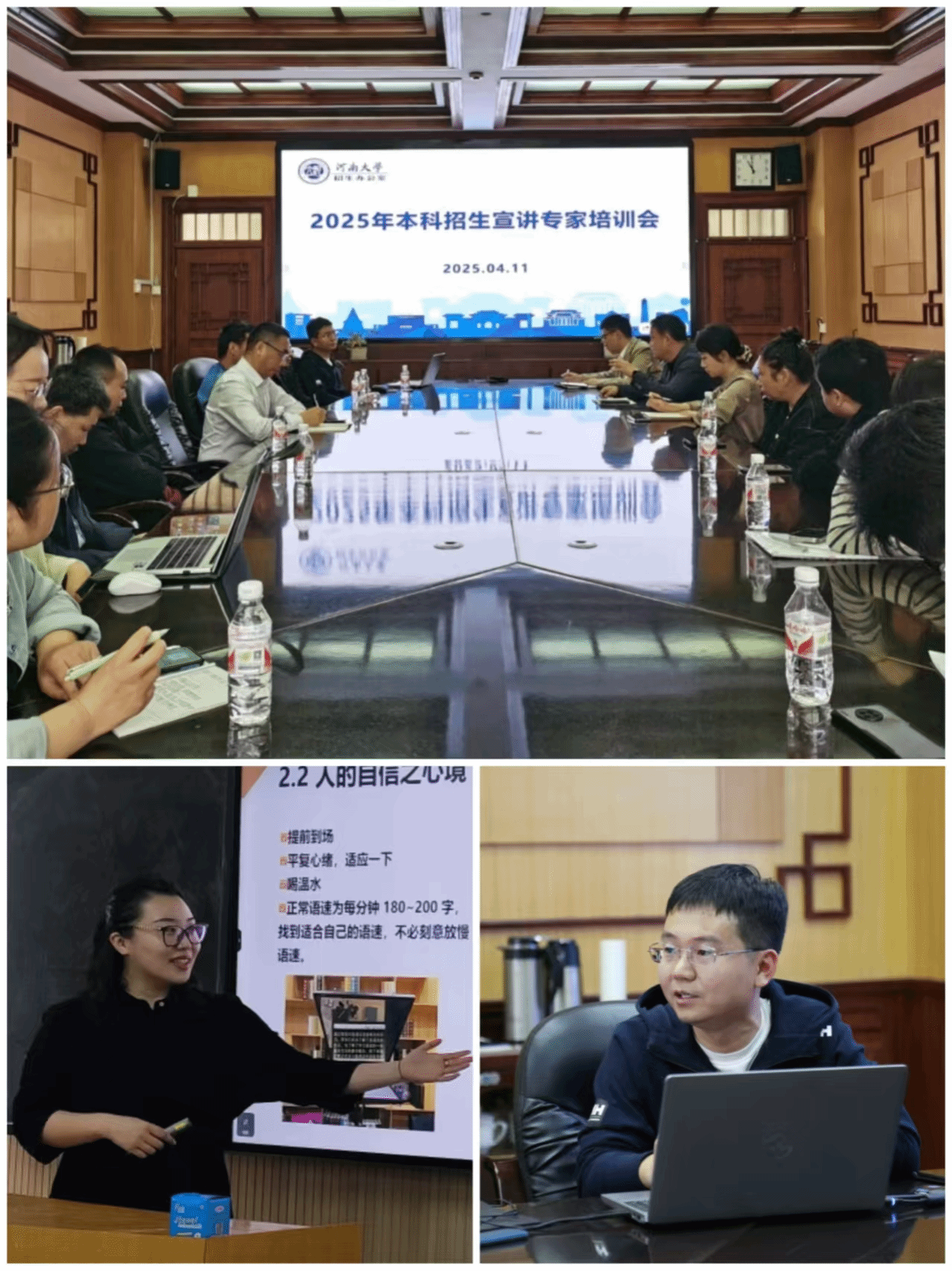4月11日,2025年本科招生宣讲专家培训会分别在开封明伦校区新行政楼210室及金明校区综合楼3101室召开,会议由招生办公室副主任马梁主持。本次会议特邀新闻与传播学院广告系系主任、副教授陈文泰,以及地理与环境学院副教授、博士生导师朱文博两位老师进行讲授。