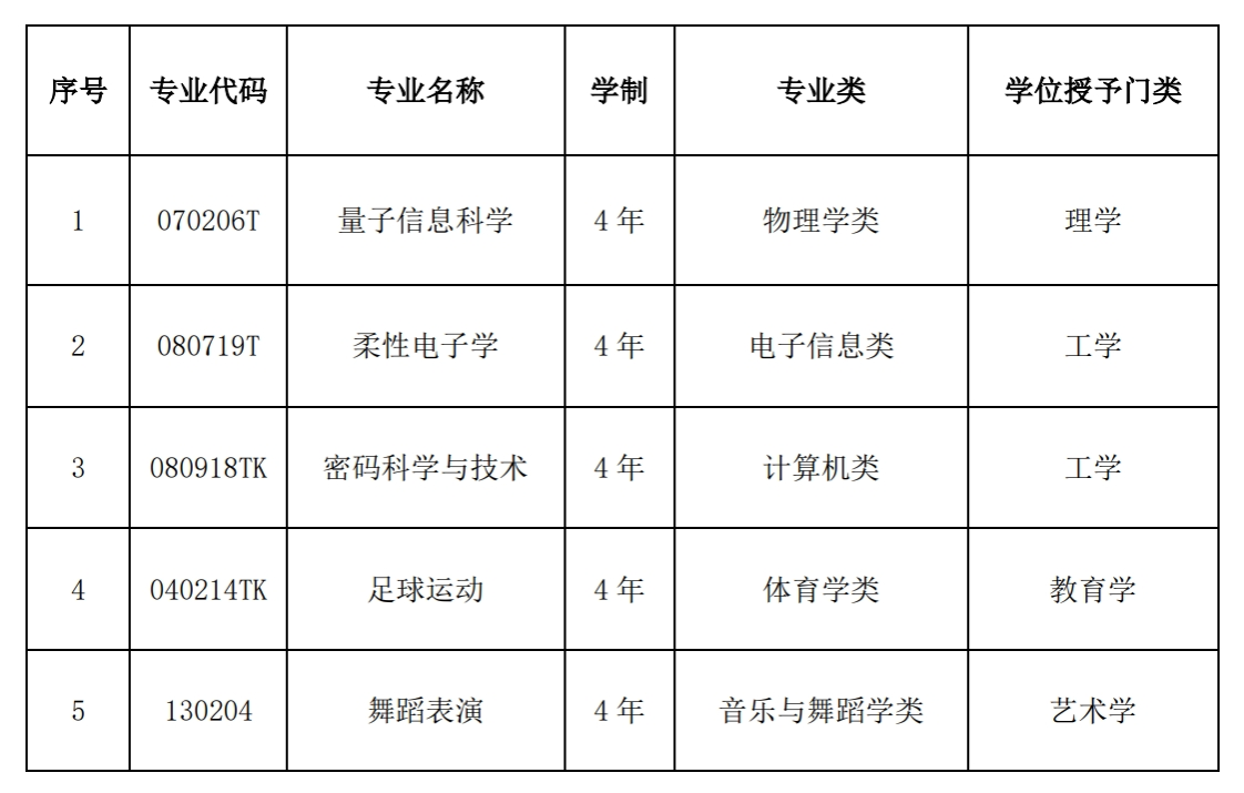 近日,教育部发布《关于公布2023年度普通高等学校本科专业备案和审批结果的通知》(教高函〔2024〕6号),我校申报的量子信息科学、柔性电子学、密码科学与技术、足球运动、舞蹈表演等5个本科专业成功获批。其中,足球运动专业为批准列入《普通高等学校本科专业目录(2024年)》的新专业。