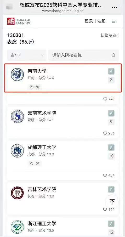 表演,A级,综合排名8/86所