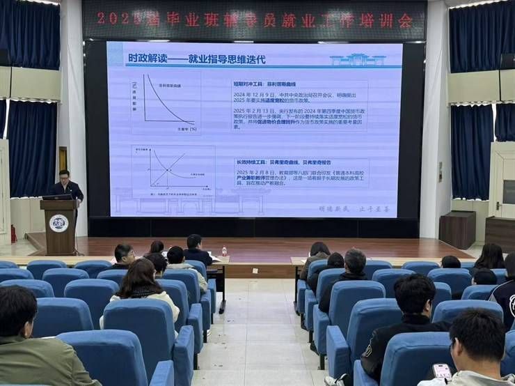 会上,就业市场科李玉峰在就业形势分析与招聘部署环节,与大家共同学习党二十大和二十届三中全会精神,将其作为就业思政工作的关键内容,并传递给辅导员。通过解读“有为政府、有效市场”时,他借助经济曲线剖析政策对就业的影响,引导辅导员在指导学生就业时融入时政思维。在“推进城乡融合”方面,他鼓励辅导员引导学生关注乡村振兴相关岗位,将个人职业发展与国家战略相结合,强化学生的家国情怀与社会担当,强化思政教育在就业指导中的引领作用。