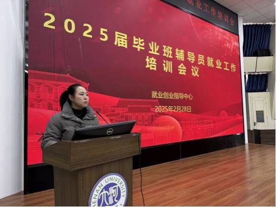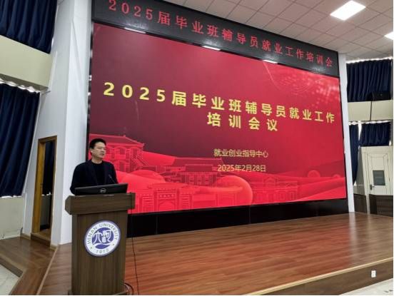 就业创业指导中心在金明校区锥形报告厅举办2025届毕业班辅导员第二次就业工作培训会。就业创业指导中心主任李从国、学生处副处长李平、各学院及研究生培养单位毕业班辅导员、就业创业指导中心全体人员参加会议。会议由就业创业指导中心副主任栗晓文主持。