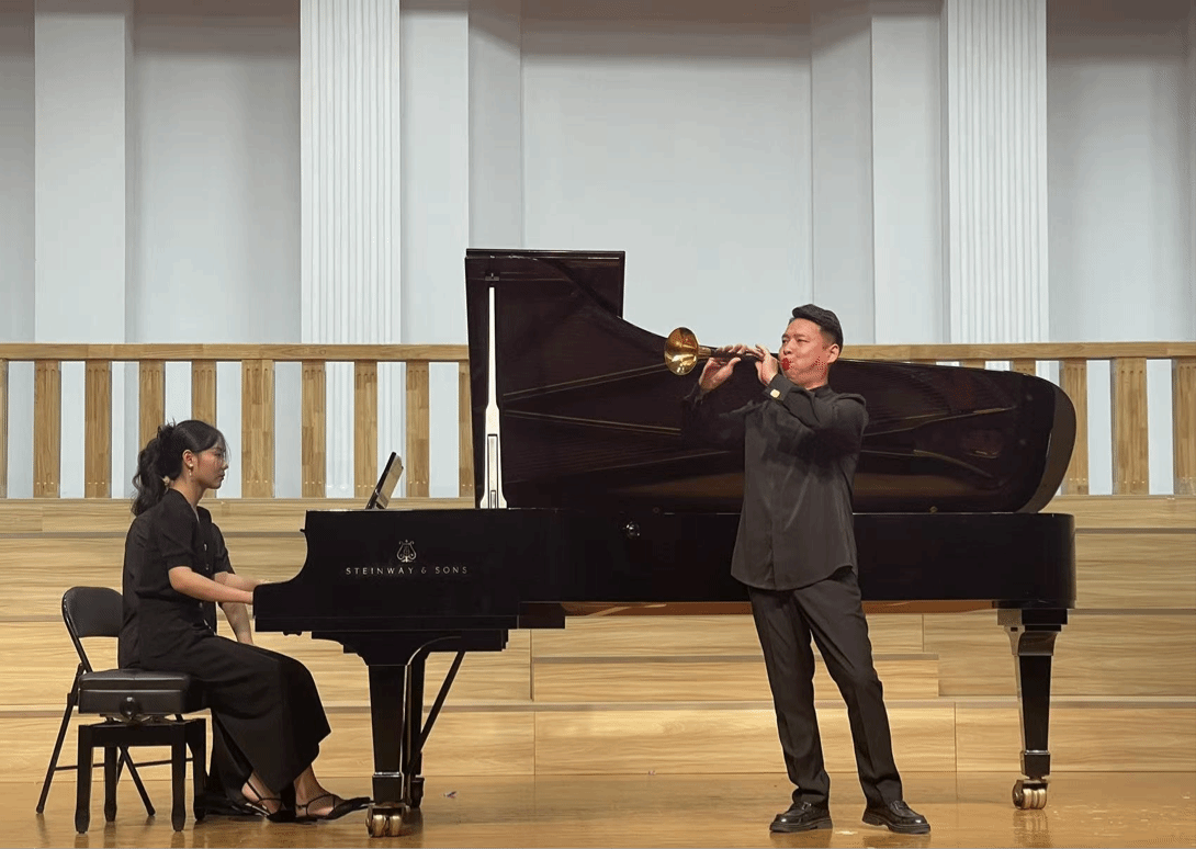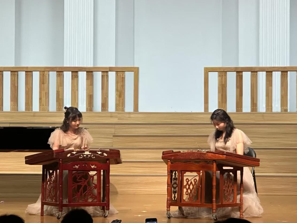 不仅学生们倾情投入,各位老师们也在音乐会上大显身手,姜勇老师与刘可可老师分别以笙独奏《晋调》、唢呐独奏《锦瑟年华》引燃全场,用音乐歌颂了祖国的大好河山,展现了时光流转中的生命张力。殷诚老师一曲双簧管与古筝重奏《月宫》,以音乐为舟,搭建起一座沟通的桥梁,使两件乐器完美融合,并共同编织了一副绮丽的音乐图景,它不仅仅是一首乐曲,更是一封献给祖国的情书。