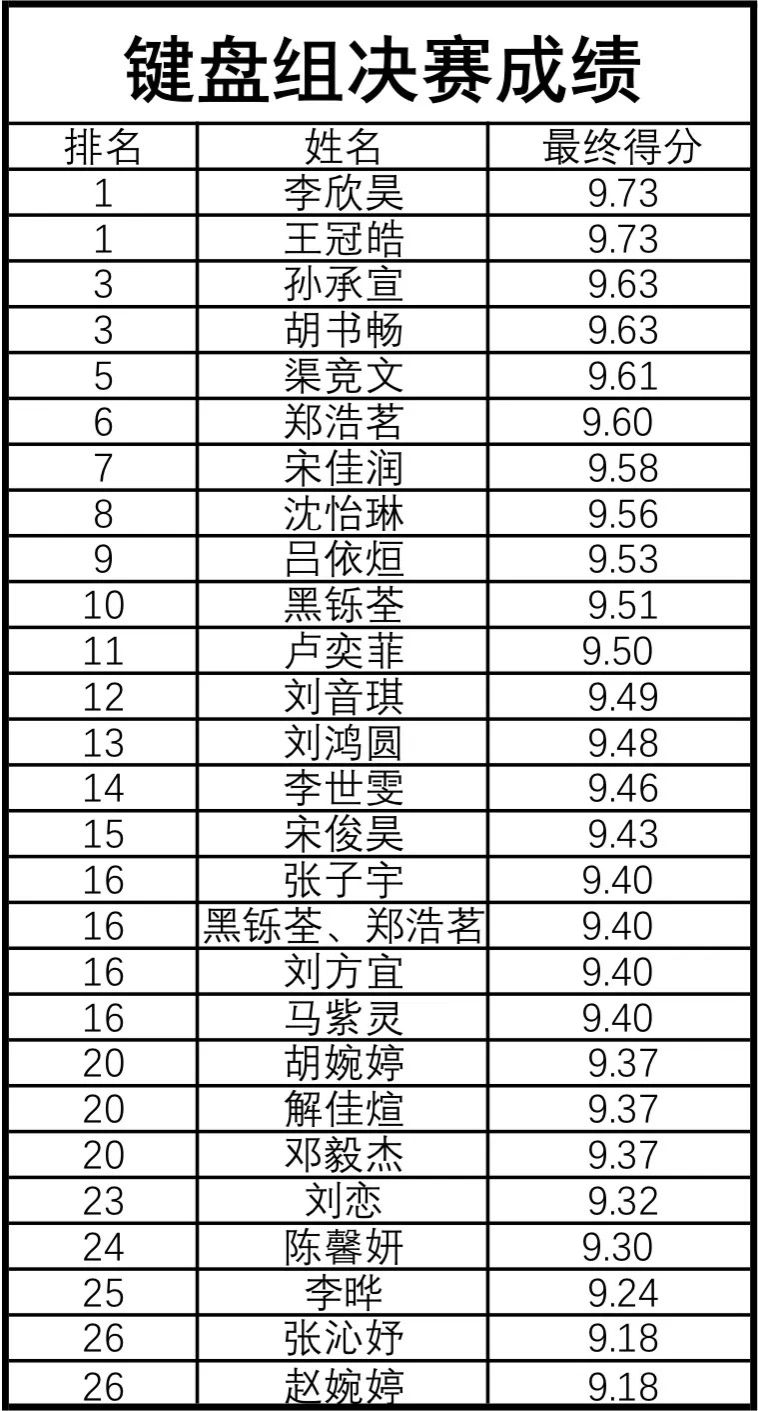 12月9日晚、10日晚是键盘组的两场决赛,由钢琴系主任潘伟老师担任监审,副主任吕华、副主任张杰、顾笑瑜、刘莎莎、王莺等老师担任专业评委,音乐理论系副主任赵璞老师担任综合素质评委。比赛中,钢琴专业的同学带来了属于他们青春的华章。他们以饱满的激情为我们带来一首首优秀的作品,指尖旋转跳跃,像是一只只舞动的蝴蝶于黑白琴键上绽放出生命的五彩缤纷。