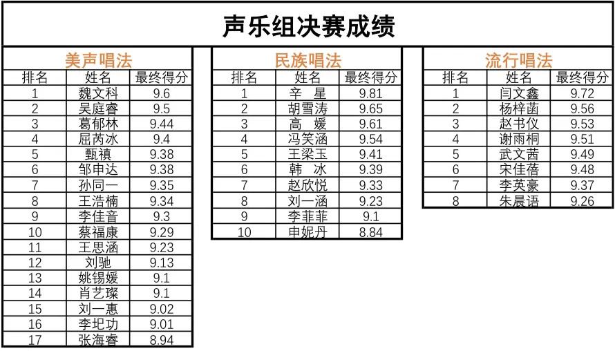 在12月12日晚、13日晚是声乐组的两场决赛,由博士生导师韩梅教授担任美声组监审,由姬群教授担任民族组与流行组监审,声歌系副主任张宗伟、副主任虎翼、李静、梁袁媛、郭晓艳、廖志林、直爱妩、郑慧玲、李蓓、朱绮恒等老师担任专业评委,音乐理论系主任康长安老师担任两场综合素质评委。美声唱法的选手气息悠长、共鸣饱满,民族唱法的选手婉转灵动、从容自信,流行唱法的选手风格多变、歌舞并用,比赛高潮迭起,掌声、喝彩声不绝于耳。