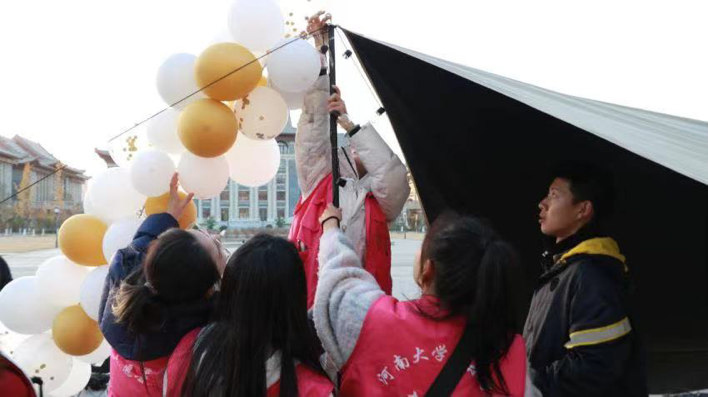 的志愿者们便乘坐大巴车前往郑州校区进行音乐节的准备工作。志愿者们分为机动组、设备维护、场地维护等各个小组,吹气球、搭帐篷、搬设备、发宣传页,分工明确,井然有序。演员们也提前到场,一遍遍走场排练,精确站位,确保音乐节的顺利开展。